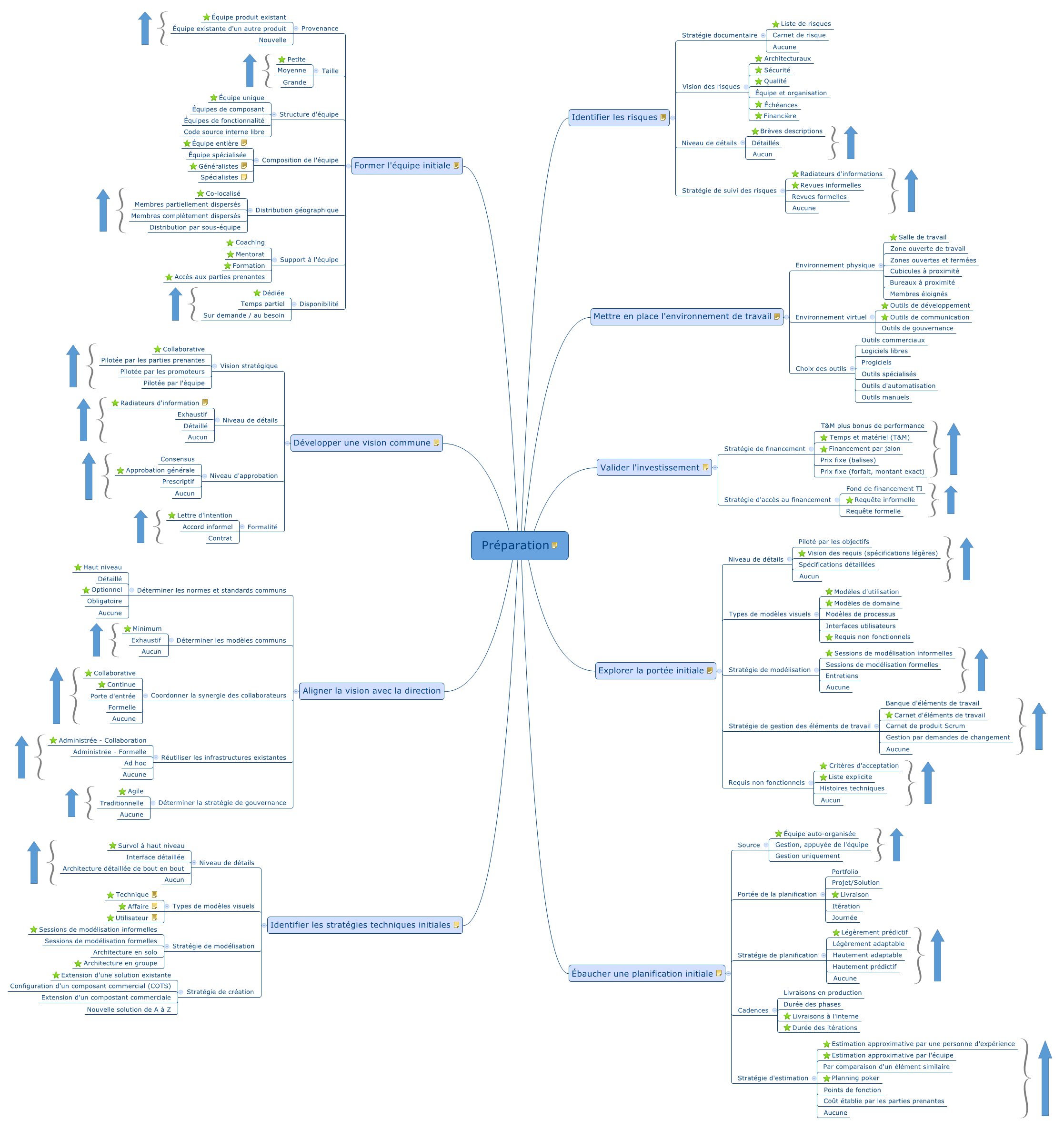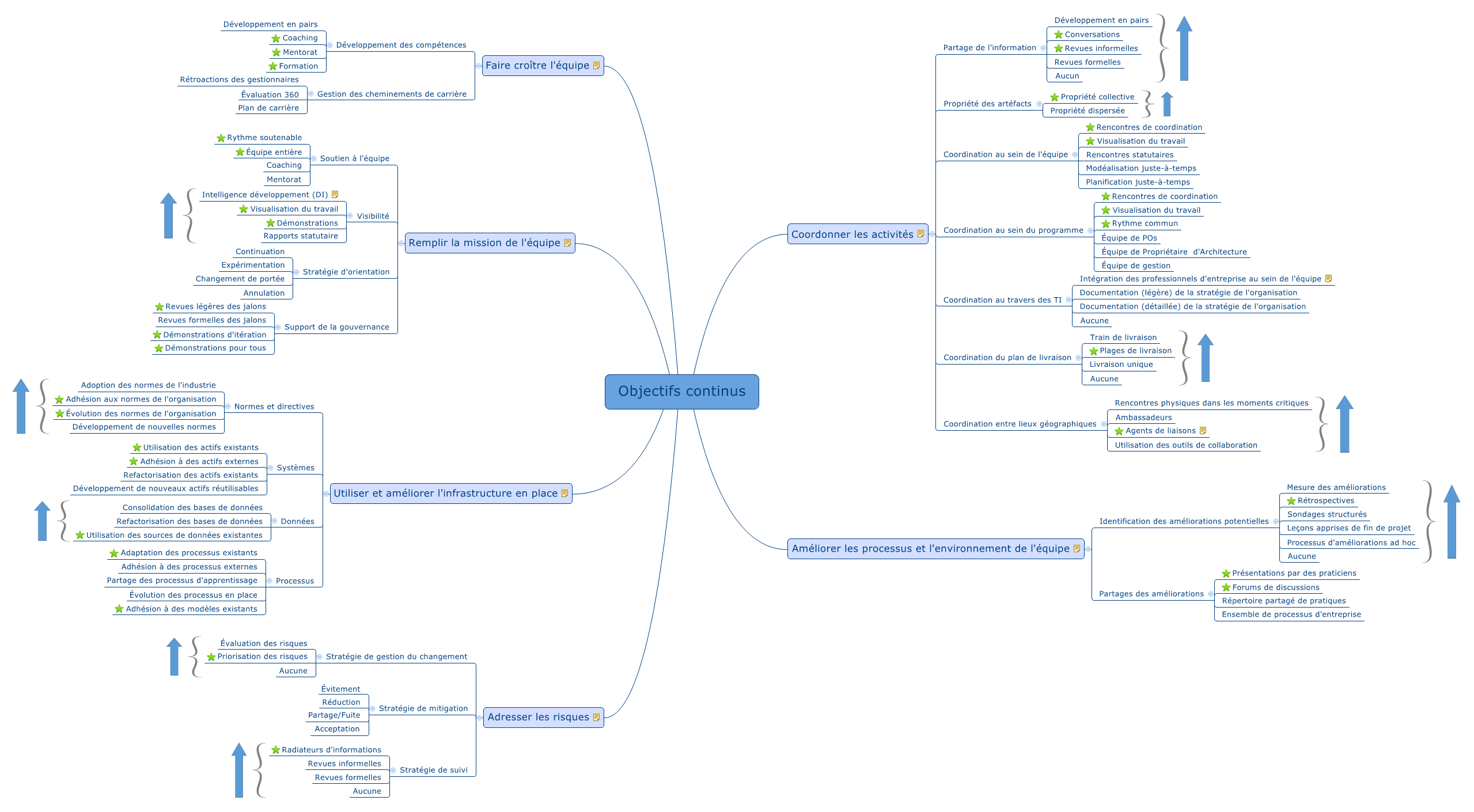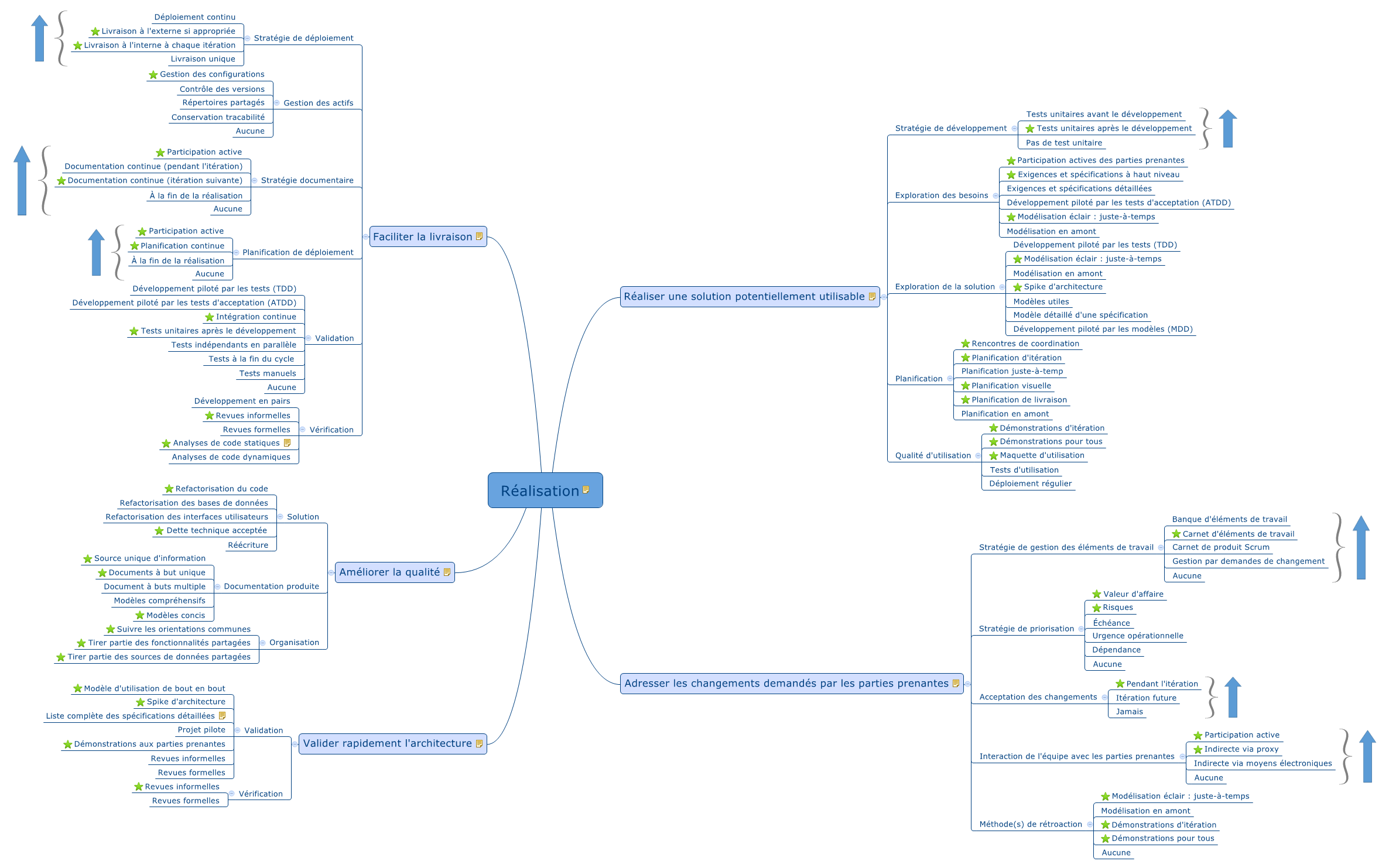 Les flèches indiquent une préférence (meilleure en haut) dans la technique ou stratégie à prioriser. Les étoiles indiquent les gains rapides lors d’une implantation de l’Agilité Disciplinée.