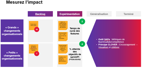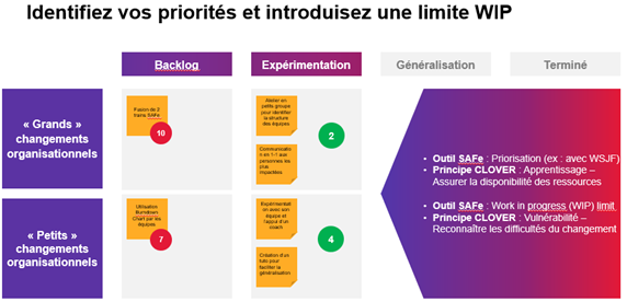 Afin d’appliquer le cadre CLOVER, nous partageons avec vous ci-dessous une démarche appliquant les principes d’agilité, principalement Kanban et SAFe, à la gestion du changement.