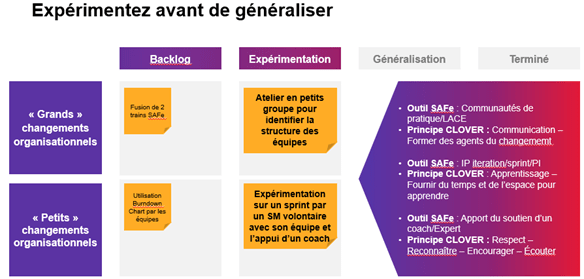 Expérimenter à petite échelle le changement, que ce soit en réalisant l’équivalent d’une preuve de concept (PoC) au sein d’une équipe, pour une fonctionnalité ou autre, permet de se confronter rapidement à la réalité du terrain, de générer des apprentissages qui serviront au déploiement global, et de développer des agents du changement qui auront bénéficié d’un soutien privilégié et auront une influence rassurante auprès de leurs pairs.