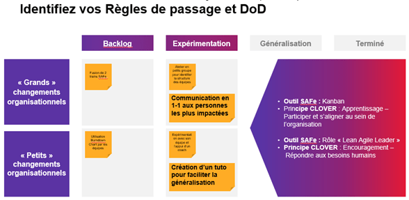 L’identification des règles de passages et de la Définition de terminé à chaque étape de la mise en œuvre du changement est un outil qui permet d’assurer la qualité de l’accompagnement, intégrant notamment le respect des collaborateurs et collaboratrices tout du long du processus.