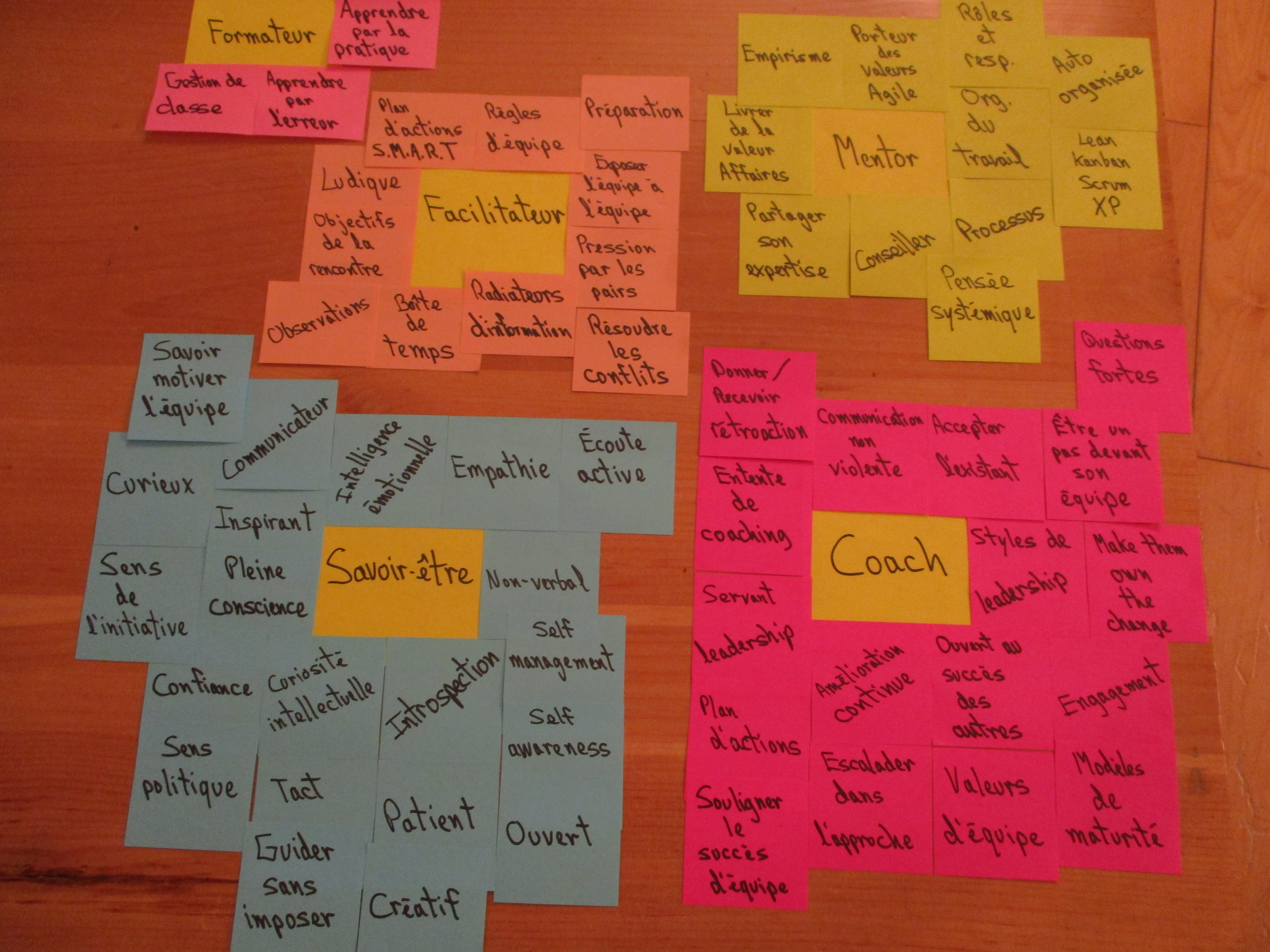 J’ai regroupé les Post-It par thème (formateur, facilitateur, mentor, coach et savoir-être). Ma première constatation fût que les thèmes coach et savoir-être étaient les plus forts. Cela fait du sens à mon avis puisque ce sont souvent ces compétences que j’utilise dans mon travail. Néanmoins, je fais appel à des postures de formateur, faciltateur et mentor au courant de ma journée bien que ces postures soient moins présentes.